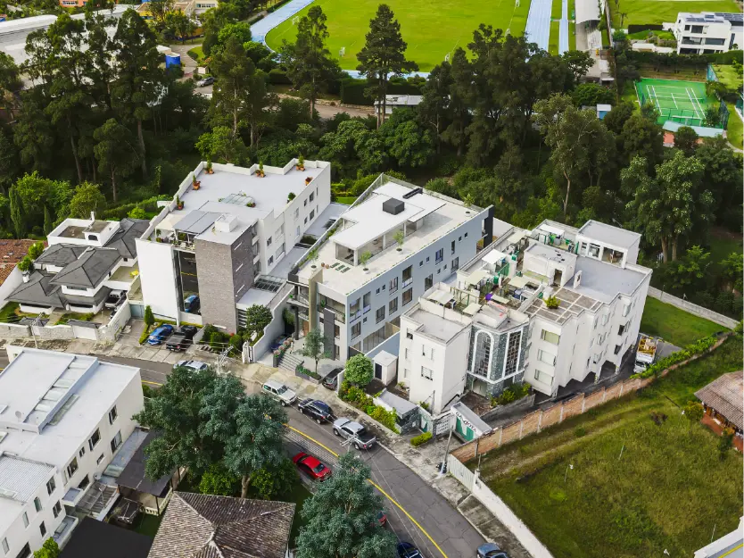Edificio de 3 pisos con Departamentos, Suites y Dúplex. Con balcones y patio. Vistas aéreas comunales pensadas para tu comodidad y esparcimiento.